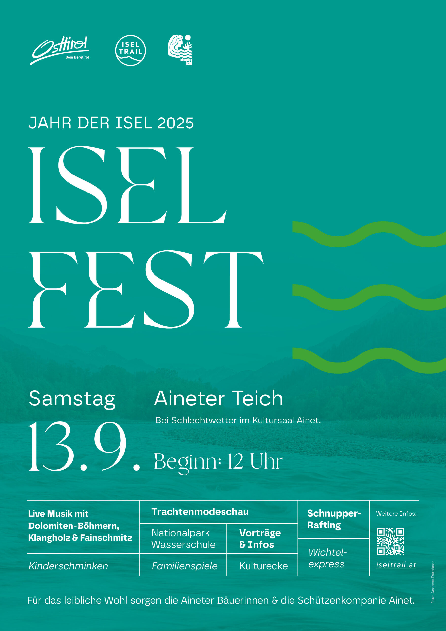 Wir laden euch herzlich, gemeinsam mit dem Tourismusverband Osttirol und der Gemeinde Ainet, zum Iselfest am 13.09.2025 in Ainet ein. Ab 12:00 Uhr könnt ihr vorbeikommen, Kulinarik, Kunst und Kultur genießen. Für ein vielseitiges Programm zum Mitmachen und Entdecken ist ab 13:00 Uhr gesorgt. Genauso wird auch musikalisch einiges geboten – wir freuen uns darauf zusammen positive Strömungen zu schaffen!